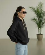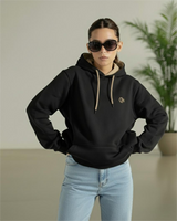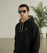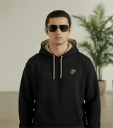 Elevate your everyday style with this stylish Black Cotton Fleece Hoodie, crafted from 300 GSM premium cotton fleece for exceptional warmth and comfort. Featuring a soft beige lining inside the hood and matching beige adjustable drawcords, this hoodie adds a subtle contrast to the sleek black exterior for a modern look. Designed with a roomy front pouch pocket, ribbed cuffs, and hem for a snug, secure fit, it’s perfect for casual wear, workouts, or cozy lounging. The small embroidered logo on the left chest adds a sophisticated brand touch without overpowering the minimalist design.